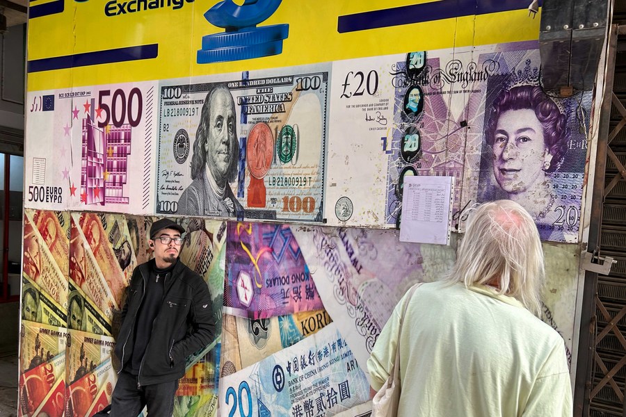 People stand in front of a foreign exchange office in Cairo, Egypt, on Feb. 10, 2023. (Xinhua/Ahmed Gomaa)
