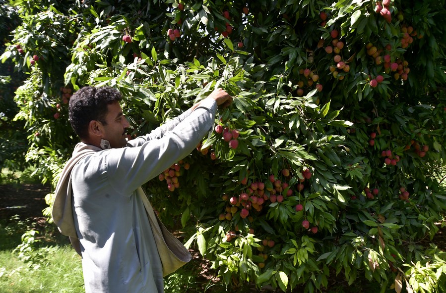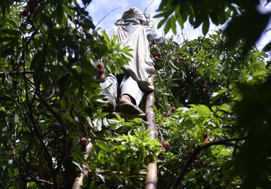 A worker harvests lychee fruits in an orchard on the outskirts of northwest Pakistan's Peshawar on July 10, 2023. (Photo by Saeed Ahmad/Xinhua)