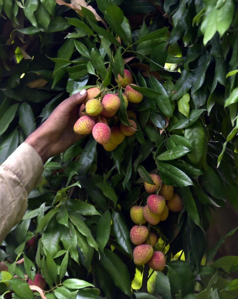 Lychee fruits are seen in an orchard on the outskirts of northwest Pakistan's Peshawar on July 10, 2023. (Photo by Saeed Ahmad/Xinhua)