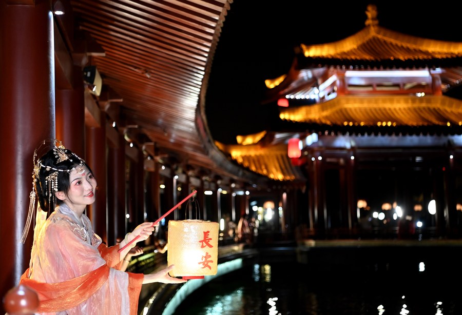 A tourist poses for photos at the Tang Paradise in Xi'an, northwest China's Shaanxi Province, April 19, 2023. The Tang Paradise, located in the south of Xi'an, is a large cultural theme park showing the lifestyle of the prosperous Tang Dynasty (618-907). (Photo by Zou Jingyi/Xinhua)