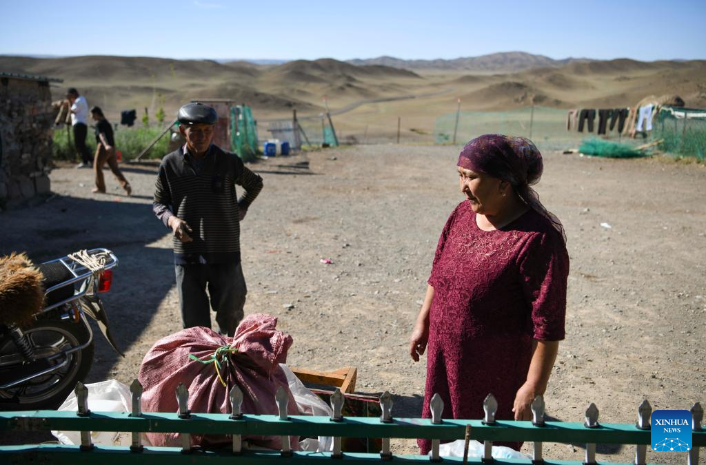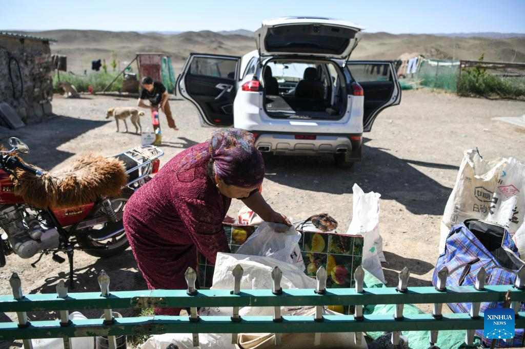 Baht Turlksi and her little daughter Kursunak prepare stuffs for the trip to the summer pastures in Yumin County, northwest China's Xinjiang Uygur Autonomous Region, July 3, 2023. On the first day of the trip, the road is relatively flat, and materials could be transported to the foot of the mountain by car. Baht Turlksi, a 53-year-old herder, lives near the majestic Baluke Mountain, which lies in the south of Yumin County, northwest China's Xinjiang Uygur Autonomous Region.