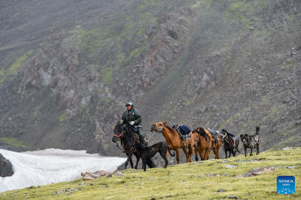 Herders move to the summer pastures in Yumin County, northwest China's Xinjiang Uygur Autonomous Region, July 4, 2023. Baht Turlksi, a 53-year-old herder, lives near the majestic Baluke Mountain, which lies in the south of Yumin County, northwest China's Xinjiang Uygur Autonomous Region.