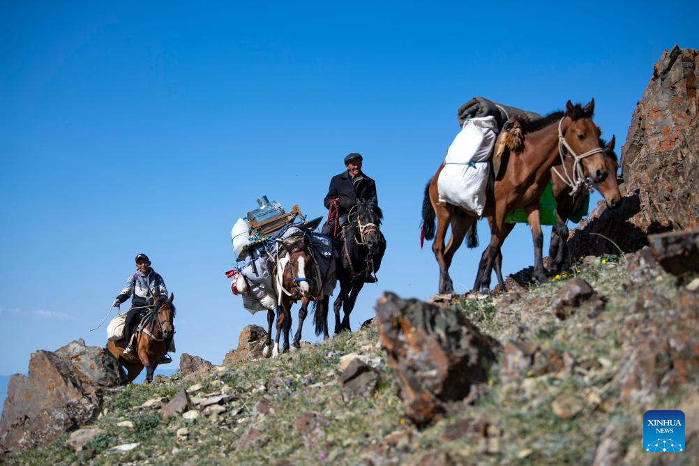 Habudelashen Nusupbek (C) and other family members move to the summer pastures in Yumin County, northwest China's Xinjiang Uygur Autonomous Region, July 3, 2023. Baht Turlksi, a 53-year-old herder, lives near the majestic Baluke Mountain, which lies in the south of Yumin County, northwest China's Xinjiang Uygur Autonomous Region.