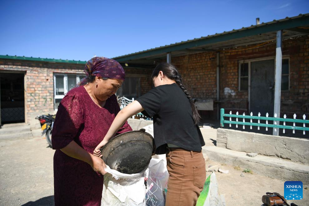 Baht Turlksi packs goods for a customer at her shop in Yumin County, northwest China's Xinjiang Uygur Autonomous Region, July 2, 2023. Apart from herding cattle for a living, the Baht's family has diversified their income sources. Baht Turlksi, a 53-year-old herder, lives near the majestic Baluke Mountain, which lies in the south of Yumin County, northwest China's Xinjiang Uygur Autonomous Region.