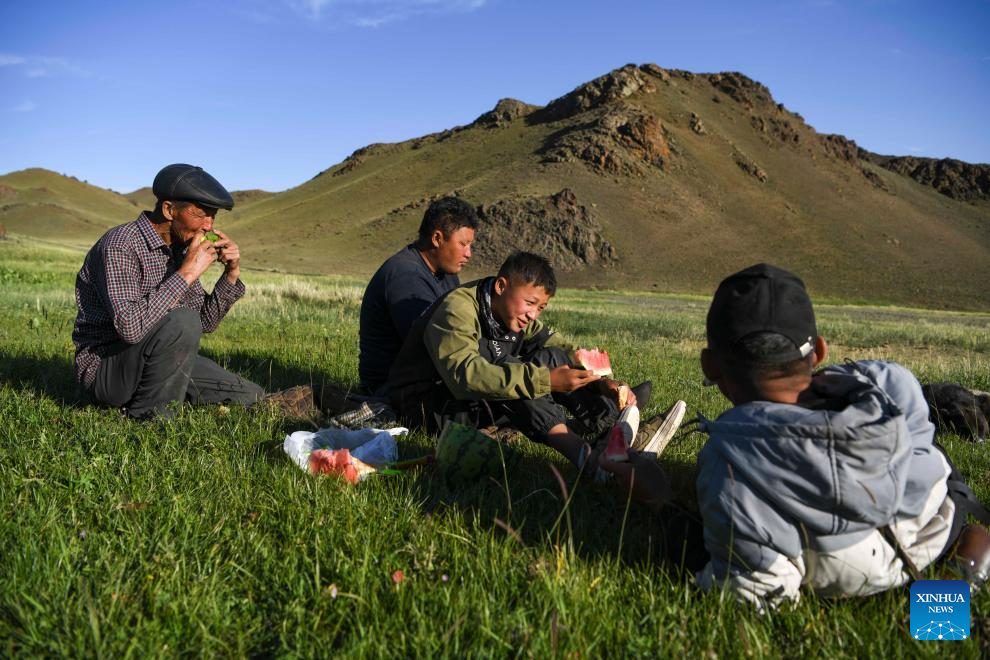 Habudelashen Nusupbek (3rd, L) and other family members have a meal after arriving at the campsite of the first day's trip to the summer pastures in Yumin County, northwest China's Xinjiang Uygur Autonomous Region, July 3, 2023. Baht Turlksi, a 53-year-old herder, lives near the majestic Baluke Mountain, which lies in the south of Yumin County, northwest China's Xinjiang Uygur Autonomous Region.