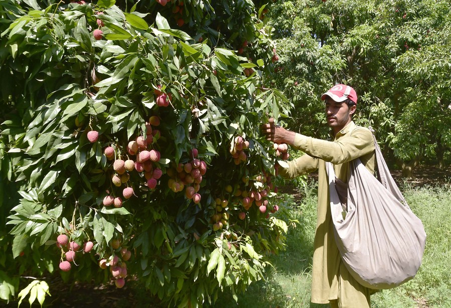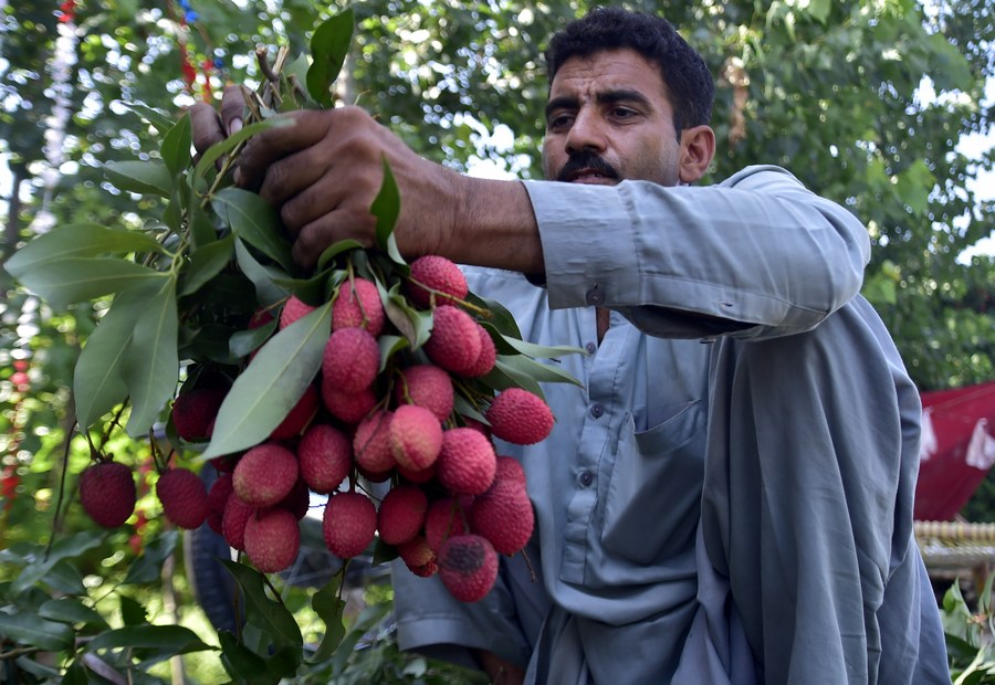 A worker harvests lychee fruits in an orchard on the outskirts of northwest Pakistan's Peshawar on July 10, 2023. (Photo by Saeed Ahmad/Xinhua) ■