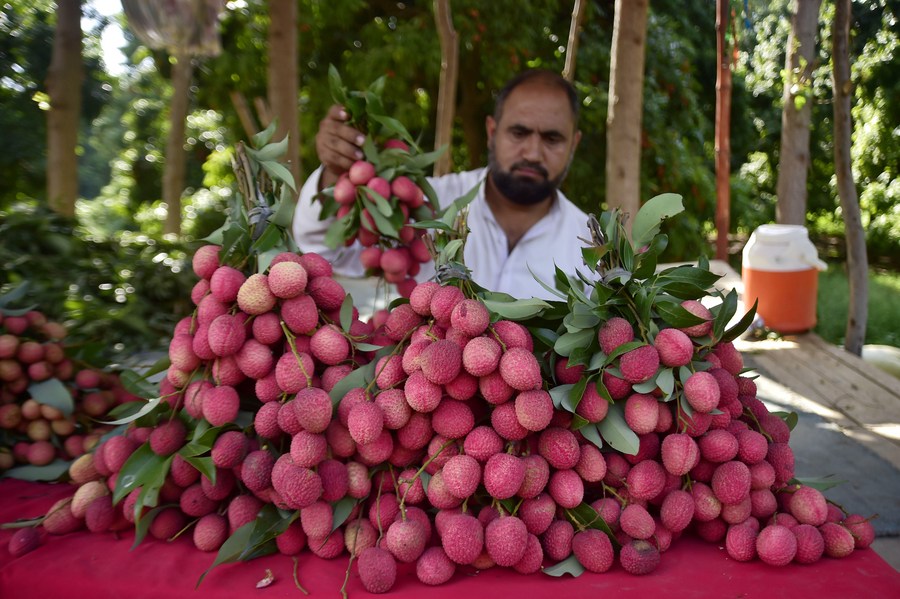 A worker checks harvested lychee fruits in an orchard on the outskirts of northwest Pakistan's Peshawar on July 10, 2023. (Photo by Saeed Ahmad/Xinhua)
