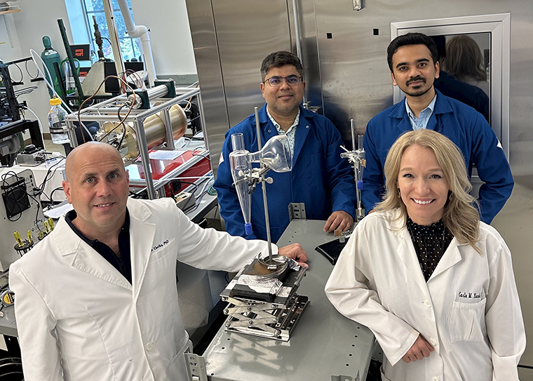 A team of researchers stand alongside the SARS-CoV-2 wet cyclone aerosol sampler at a lab in Washington University in St. Louis, Missouri, the United States. (Photo credit: Washington University in St. Louis)