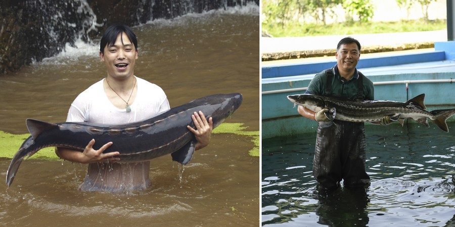 Zhou Liang displays a Yangtze sturgeon at a breeding base jointly operated by Yibin Institute of Rare Aquatic Animals and Fisheries Institute of Sichuan Academy of Agricultural Sciences in Yibin, southwest China's Sichuan Province, June 27, 2023. (Xinhua/Xu Bingjie)