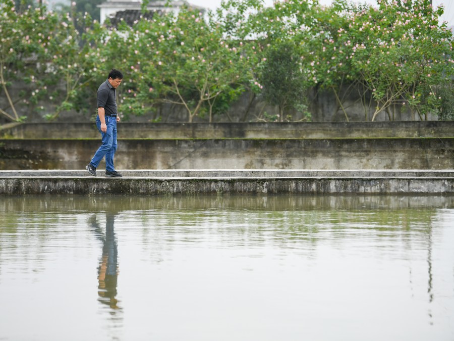 Zhou Liang checks the fishpond at a breeding base jointly operated by Yibin Institute of Rare Aquatic Animals and Fisheries Institute of Sichuan Academy of Agricultural Sciences in Yibin, southwest China's Sichuan Province, Oct. 12, 2021. (Xinhua/Wang Xi)