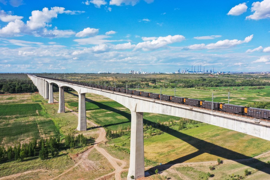 This aerial photo taken on July 8, 2023 shows a train for coal transportation in Jungar Banner, north China's Inner Mongolia Autonomous Region. (Xinhua/Liu Lei)