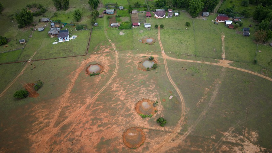 This aerial photo taken on May 20, 2022 shows the bomb craters left by the U.S. warplanes' bombing in Phonsavan of Xiengkhuang Province, Laos. According to a monitor, the United States dropped 413,130 tons of cluster munitions over Vietnam between 1965 and 1973. Concurrent with the Vietnam War, the United States dropped some 260 million cluster bombs on neighboring Laos, making Laos "the most heavily bombed nation in history." (Photo by Kaikeo Saiyasane/Xinhua)