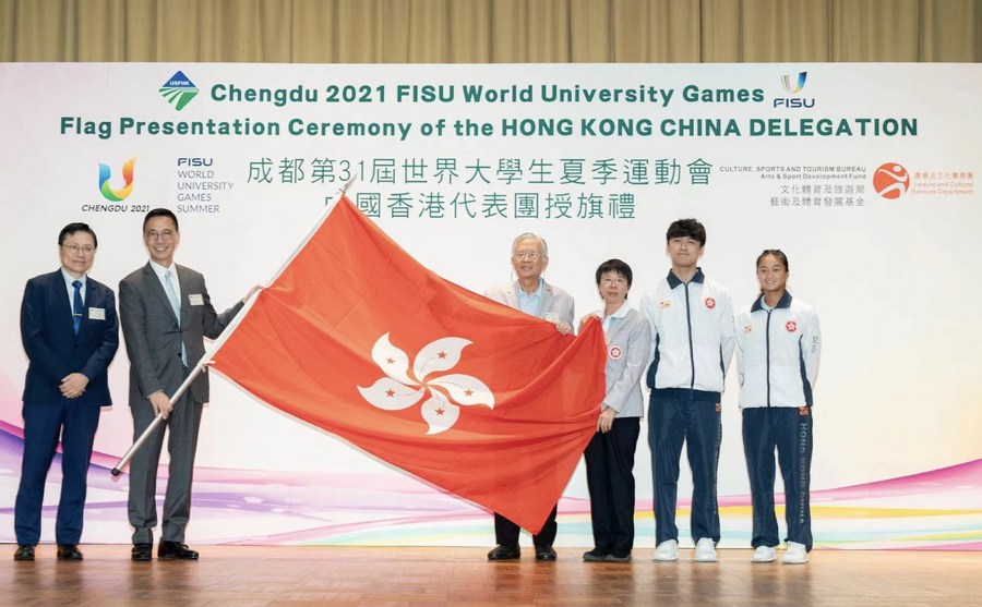 A photo shows the flag handover ceremony of Hong Kong, China delegation for the 31st FISU World University Games. (Photo courtesy of University Sports Federation of Hong Kong, China)