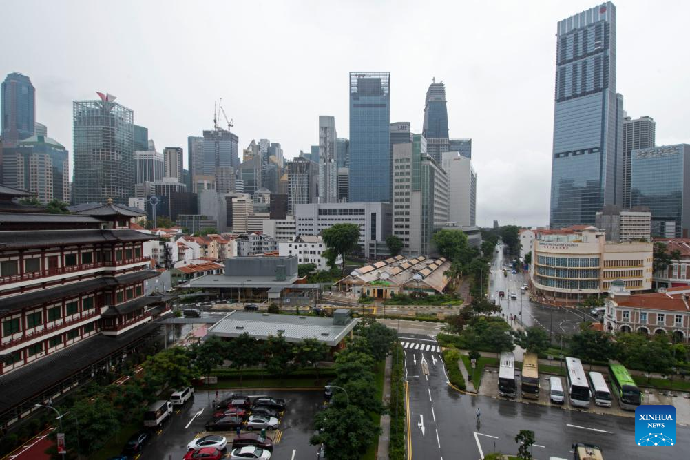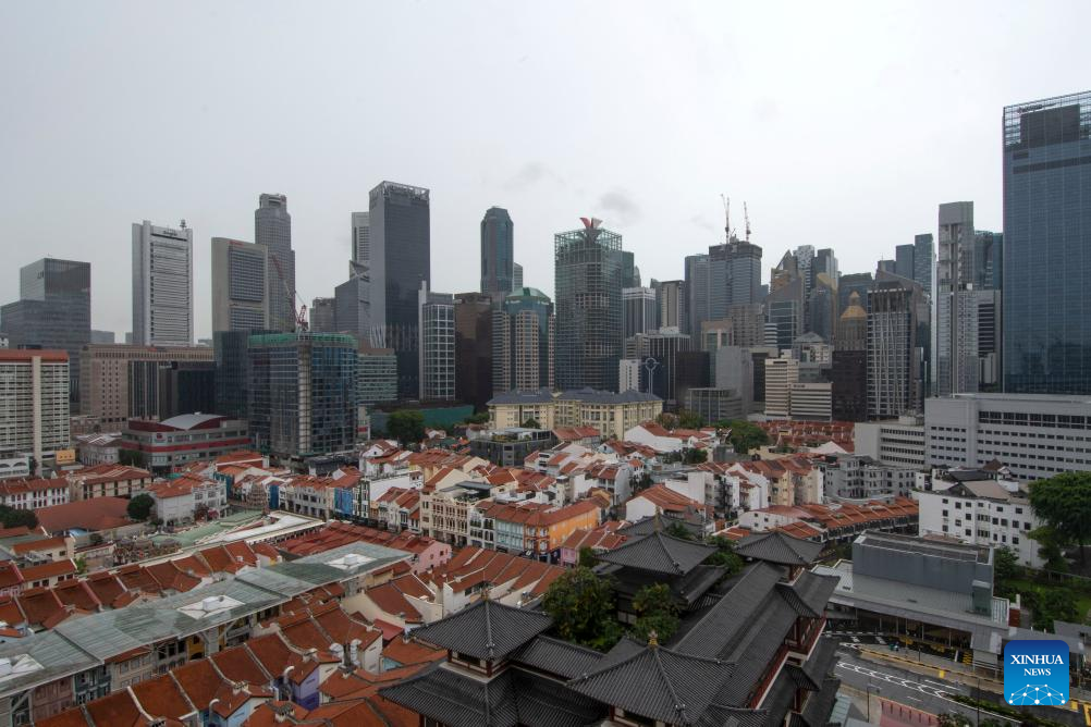 This photo taken on July 14, 2023 shows the skyline of Singapore's financial district. The Singapore economy grew by 0.7 percent year on year in the second quarter, faster than the 0.4 percent growth recorded in the previous quarter, Singapore's Ministry of Trade and Industry (MTI) announced on Friday. (Photo by Then Chih Wey/Xinhua)