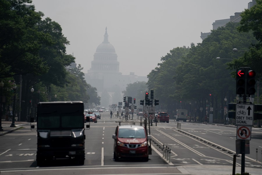 The U.S. Capitol building is shrouded in haze in Washington, D.C., the United States, on June 29, 2023. (Xinhua/Liu Jie)