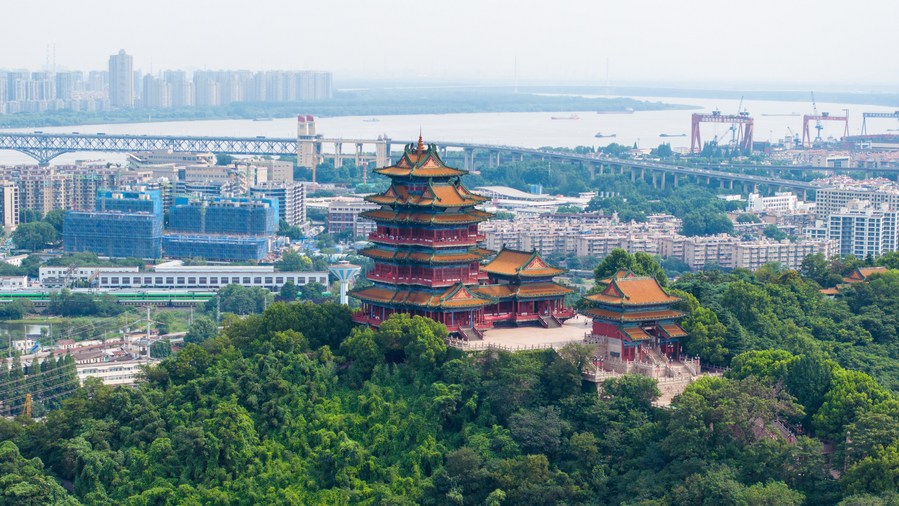 This aerial photo taken on July 12, 2023 shows the Yuejiang Tower in Nanjing, east China's Jiangsu Province. (Xinhua/Li Bo)