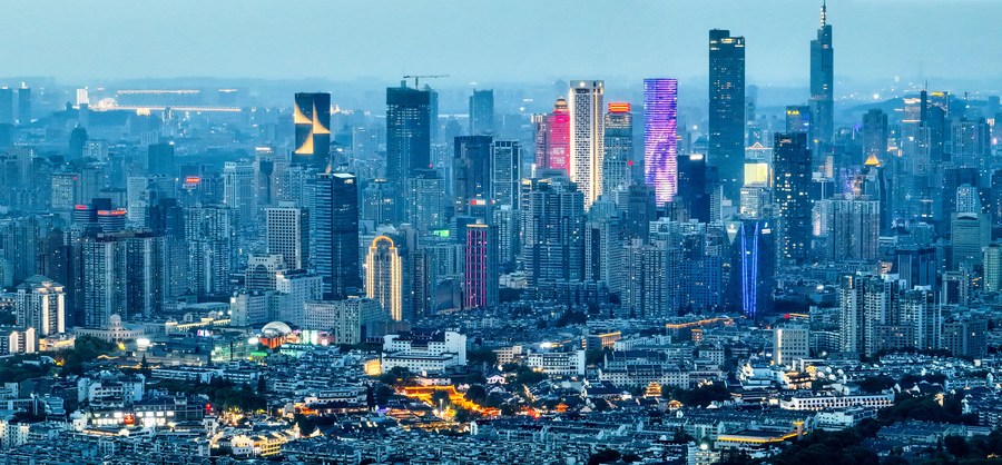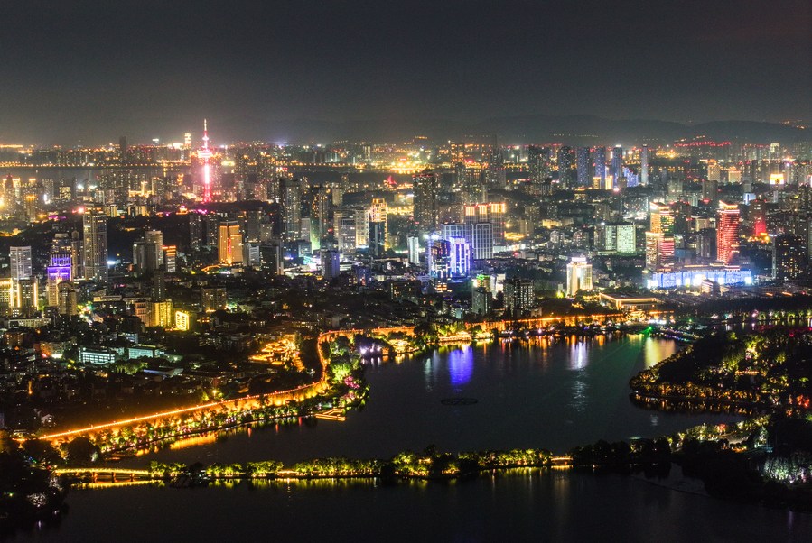 This aerial photo taken on June 8, 2023 shows night view of the "Jinling City" scenic spot in Nanjing, east China's Jiangsu Province. (Xinhua/Li Bo)
