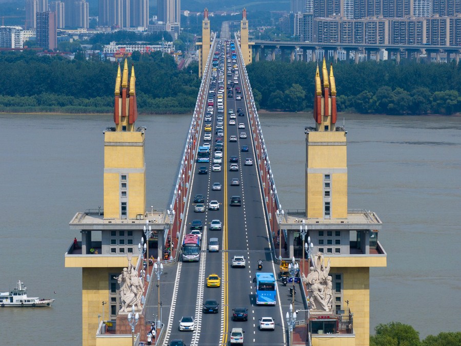 This aerial photo taken on July 12, 2023 shows the Nanjing Yangtze River Bridge in Nanjing, east China's Jiangsu Province. (Xinhua/Li Bo)