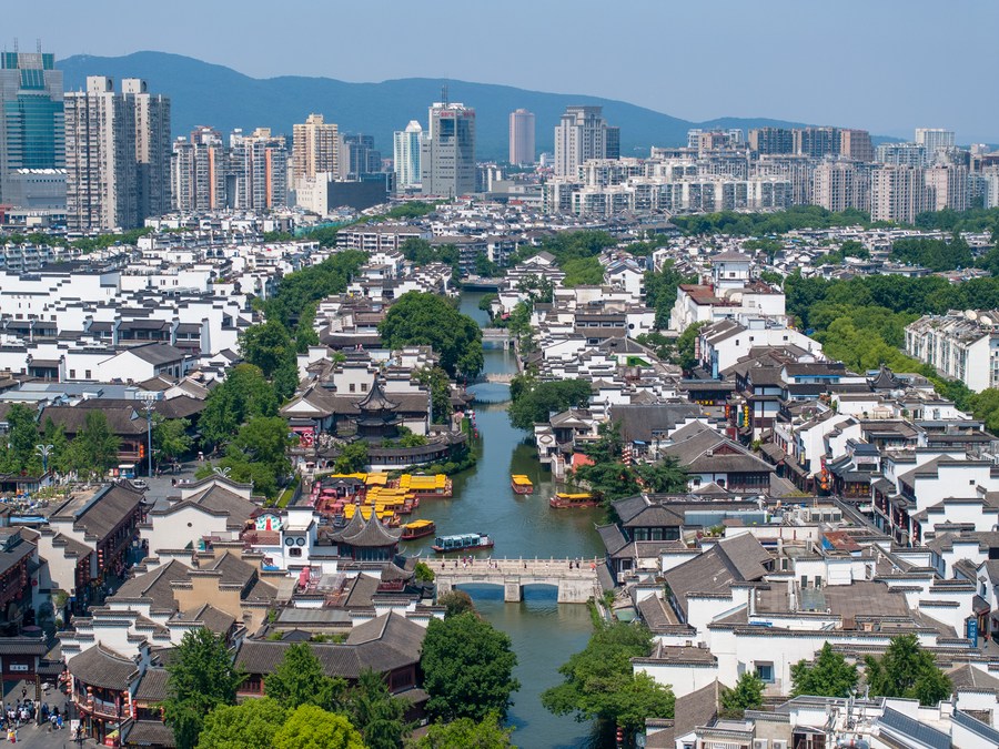 This aerial photo taken on June 11, 2023 shows the Fuzi (Confucius) Temple scenic area and the city view in Nanjing, east China's Jiangsu Province. (Xinhua/Yang Lei)