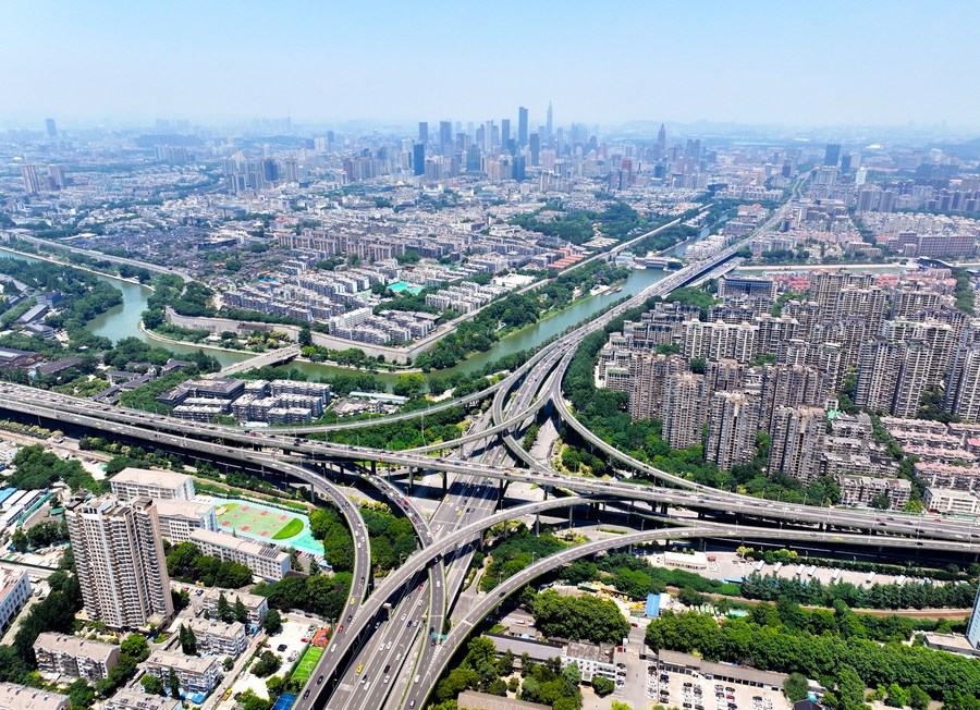 This aerial photo taken on June 9, 2023 shows the Shuangqiaomen interchange junction and the city wall of Ming Dynasty (1368-1644) in Nanjing, east China's Jiangsu Province. (Xinhua/Yang Lei)