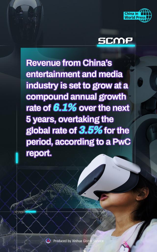 The total annual revenue of China's entertainment and media industry is set to reach around 479.9 billion USD by 2027, as adoption of cutting-edge technology such as artificial intelligence boosts productivity, according to a PwC report.