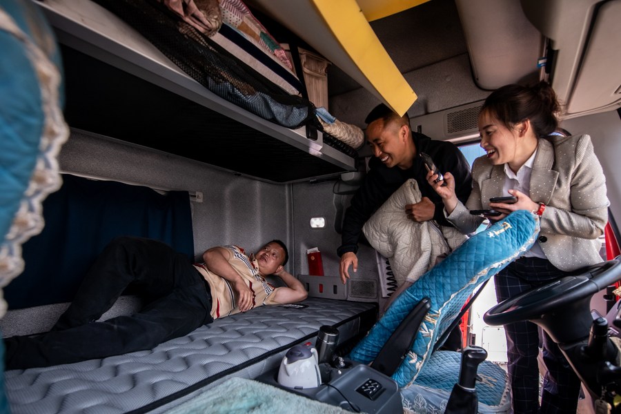 Mao Guangyou (C) and his wife Yang Ya smile after a truck driver shows his satisfaction on the "Truck Baby" mattress in Fuyuan County of Qujing City, southwest China's Yunnan Province, April 7, 2023. (Xinhua/Hu Chao)