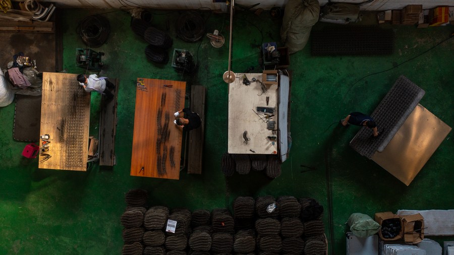 This aerial photo taken on April 7, 2023 shows the factory of "Truck Baby" mattress in Fuyuan County of Qujing City, southwest China's Yunnan Province. (Xinhua/Hu Chao)