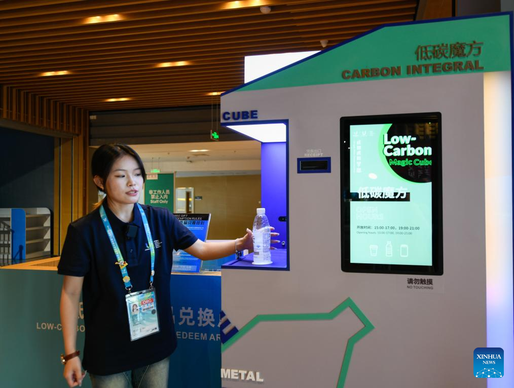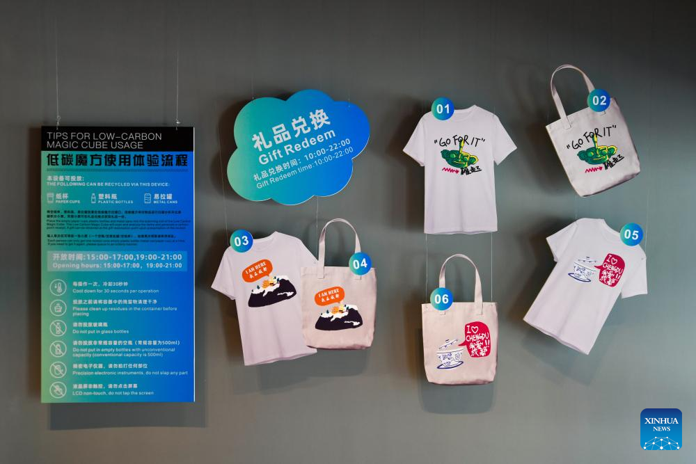 Photo taken on July 16, 2023 shows a board with tips for low-carbon "magic cube" usage and gifts for recycling in the Universiade Village, Chengdu, southwest China's Sichuan Province. (Xinhua/Xu Bingjie)
