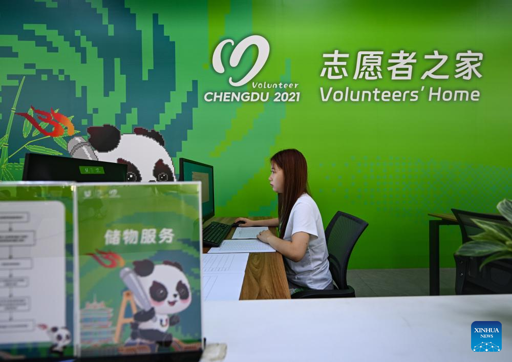 A volunteer works at the Volunteers' Home of the Universiade Village, Chengdu, southwest China's Sichuan Province, July 15, 2023. (Xinhua/Wang Xi)