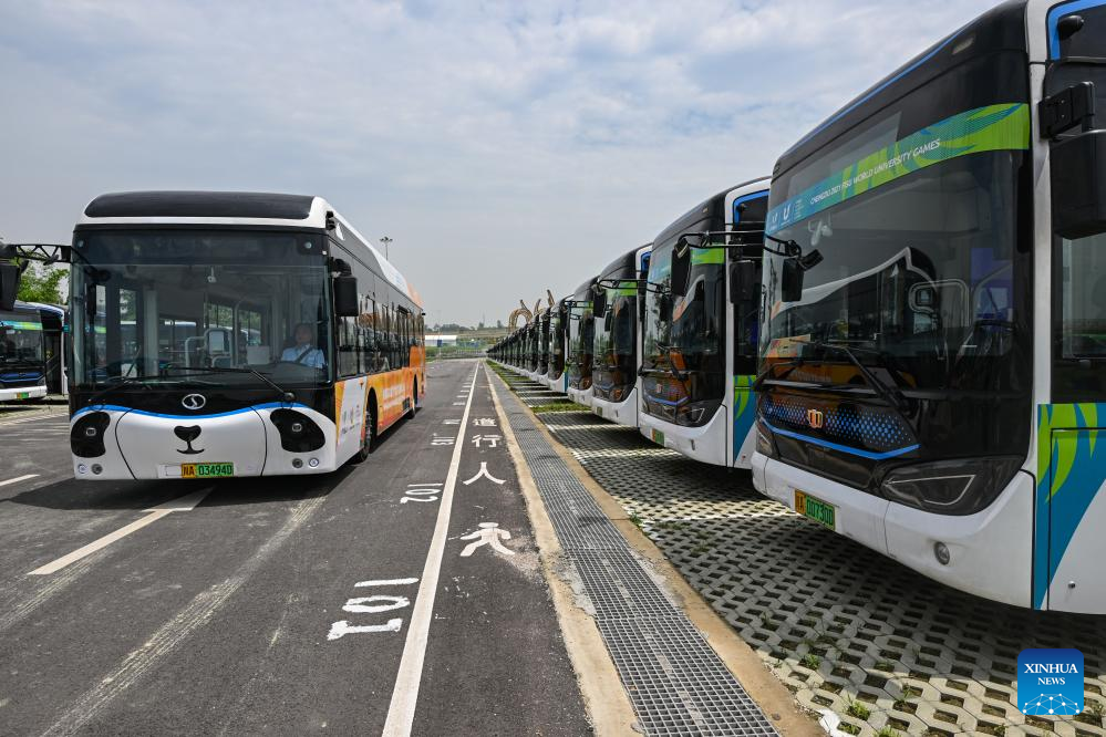 Photo taken on July 16, 2023 shows new engergy bus in the Universiade Village, Chengdu, southwest China's Sichuan Province. (Xinhua/Wang Xi)