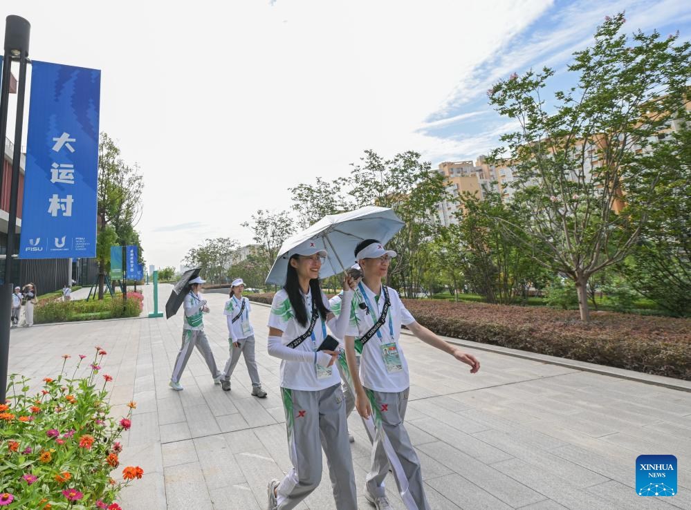 Volunteers walk in the Universiade Village, Chengdu, southwest China's Sichuan Province, July 15, 2023. (Xinhua/Wang Xi)