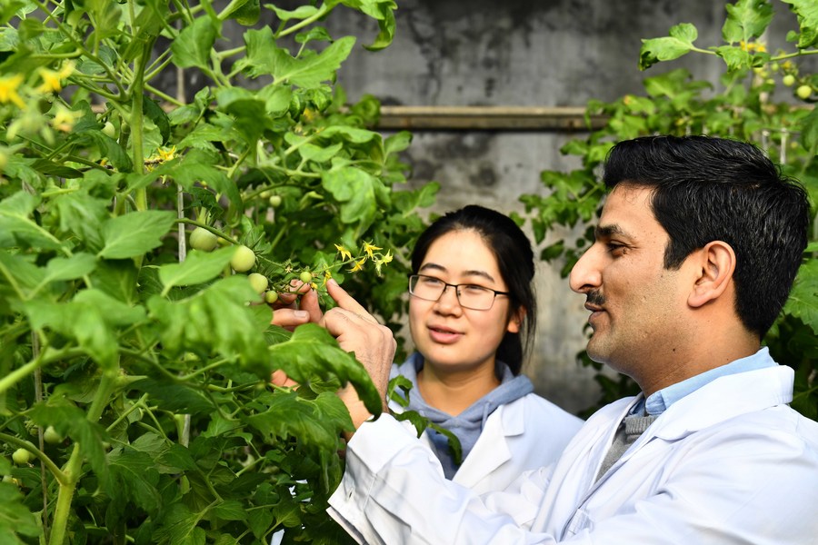Anwar Ali (R), a Pakistani student, checks the growth of tomatoes with a researcher at the Institute of Vegetables and Flowers of Shandong Academy of Agricultural Sciences in Jinan, east China's Shandong Province, Jan. 7, 2022. (Xinhua/Guo Xulei)