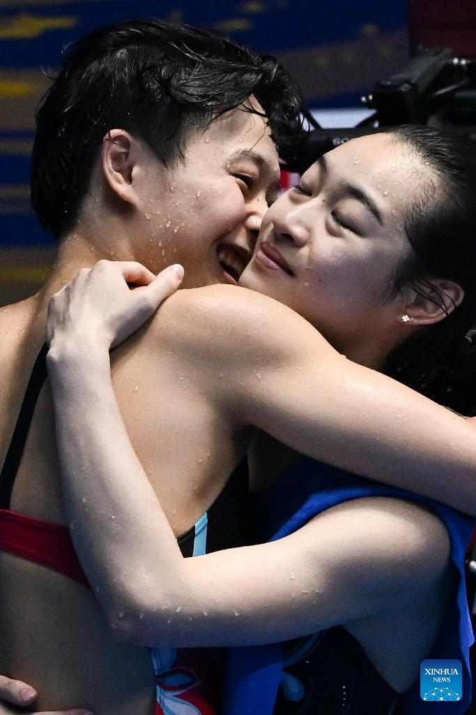 Chen Yiwen (L)/Chang Yani of China react after the women's 3m synchronised final of the World Aquatics Championships 2023 in Fukuoka, Japan, July 17, 2023. (Xinhua/Xu Chang)