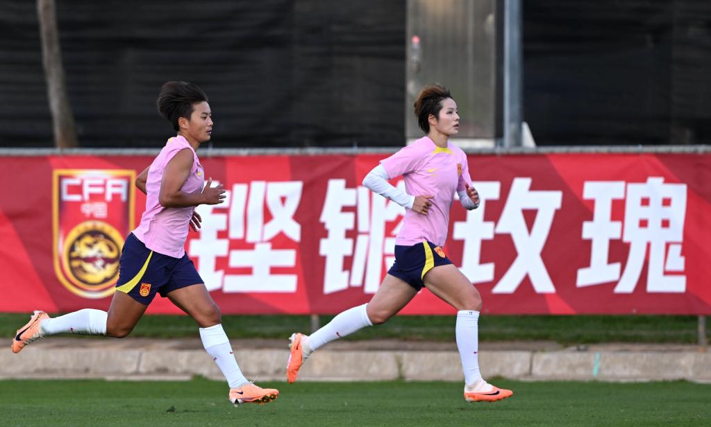 Wang Shuang (L) and Zhang Xin of China attends a training session at the Croatian Sports Centre in Adelaide, south Australia, July 18, 2023. Croatian Sports Centre is functioned as Team China's Team Base Camp for the upcoming FIFA Women's World Cup Australia & New Zealand 2023. (Xinhua/Li Yibo)