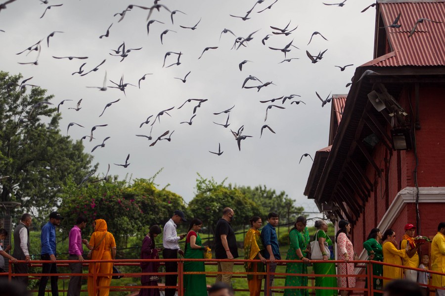 Hindu devotees pray at Pashupatinath Temple in Kathmandu, Nepal, July 17, 2023. (Photo by Sulav Shrestha/Xinhua) ■