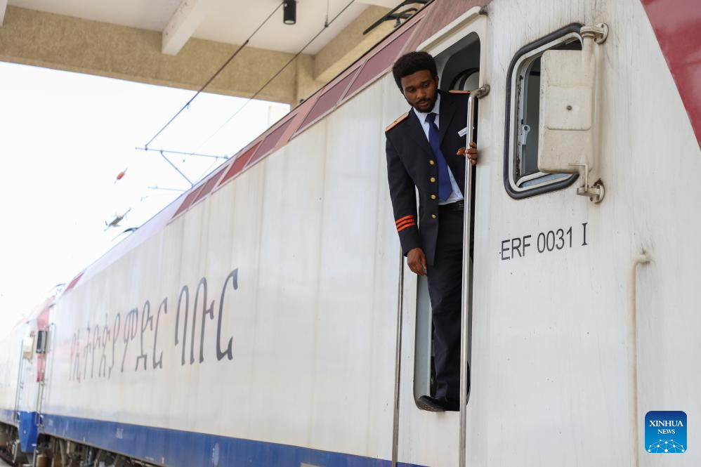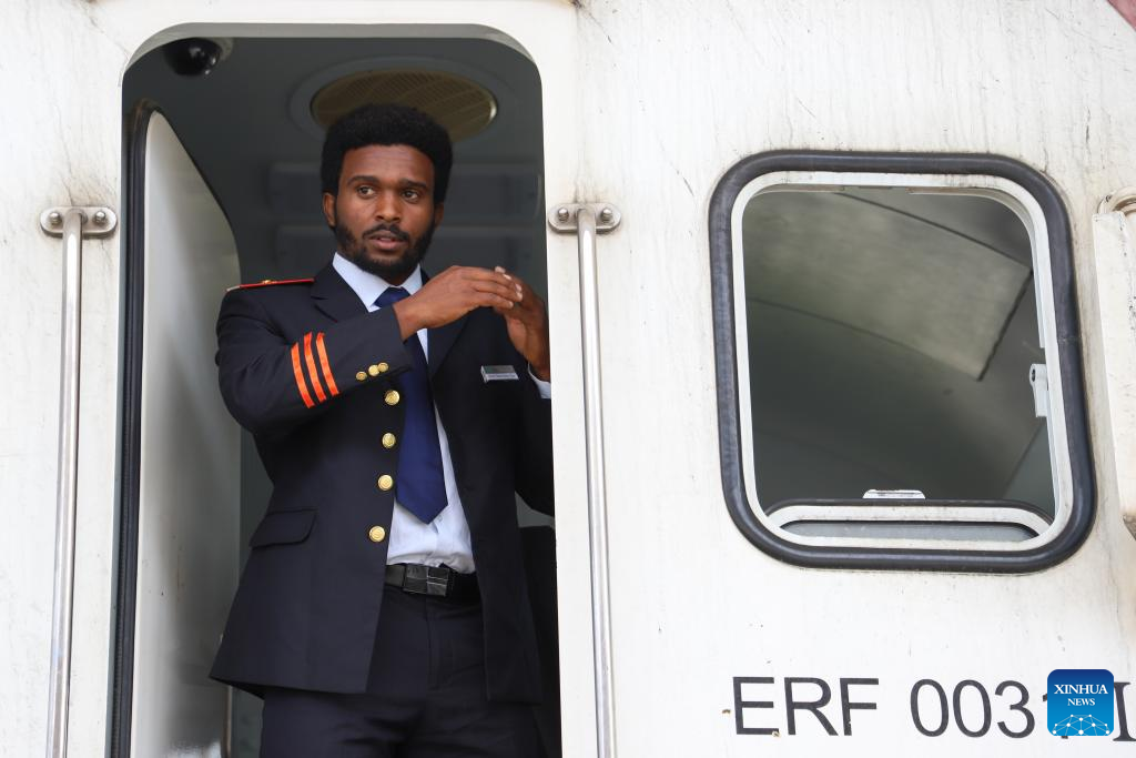 Dejen Gezu, one of the first licensed drivers for electrified trains in Ethiopia, is seen at Indode Station of Ethiopia-Djibouti standard gauge railway in Addis Ababa, Ethiopia, on July 13, 2023. The 752-km Ethiopia-Djibouti standard gauge railway, also known as the Addis Ababa-Djibouti railway, is the first electrified trans-boundary railway in Africa, a flagship project under the framework of the China-proposed Belt and Road Initiative.