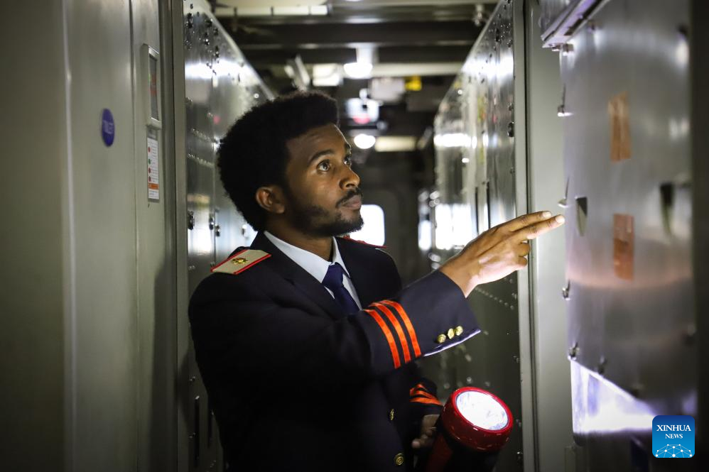 Dejen Gezu, one of the first licensed drivers for electrified trains in Ethiopia, works inside a locomotive at Indode Station of Ethiopia-Djibouti standard gauge railway in Addis Ababa, Ethiopia, on July 13, 2023. The 752-km Ethiopia-Djibouti standard gauge railway, also known as the Addis Ababa-Djibouti railway, is the first electrified trans-boundary railway in Africa, a flagship project under the framework of the China-proposed Belt and Road Initiative.