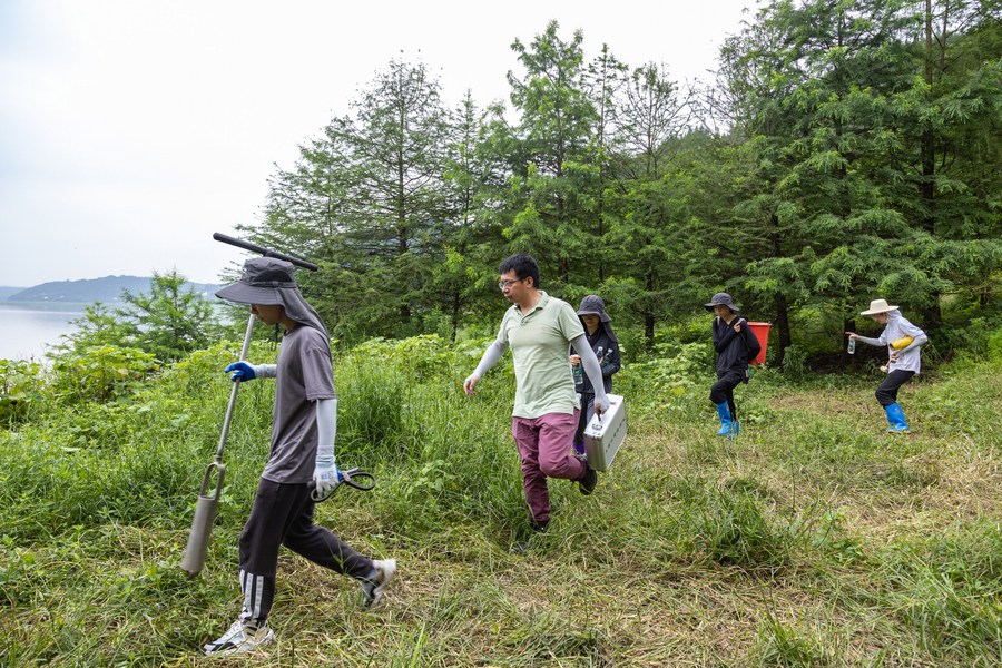 Researchers of the Institute of Mountain Hazards and Environment under Chinese Academy of Sciences (CAS) walk to a water-level fluctuation zone of the Three Gorges Reservoir in Zhongxian County, southwest China's Chongqing, July 5, 2023. (Xinhua/Chu Jiayin)
