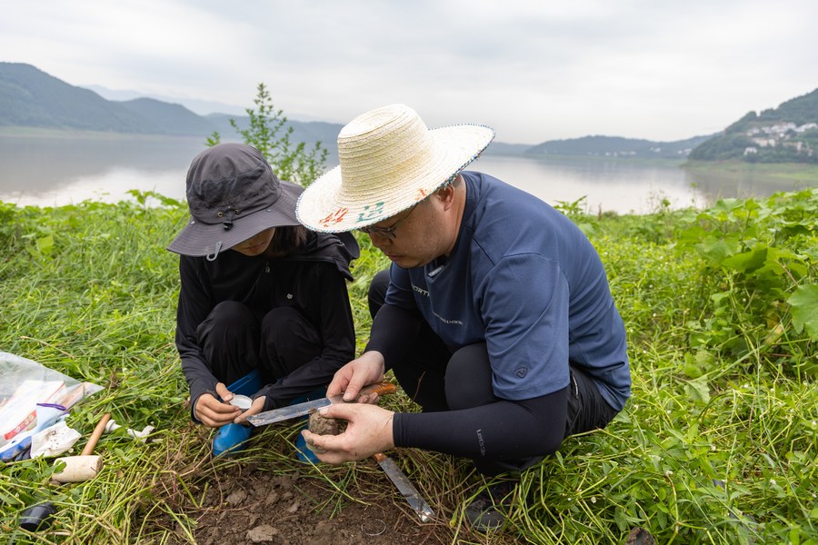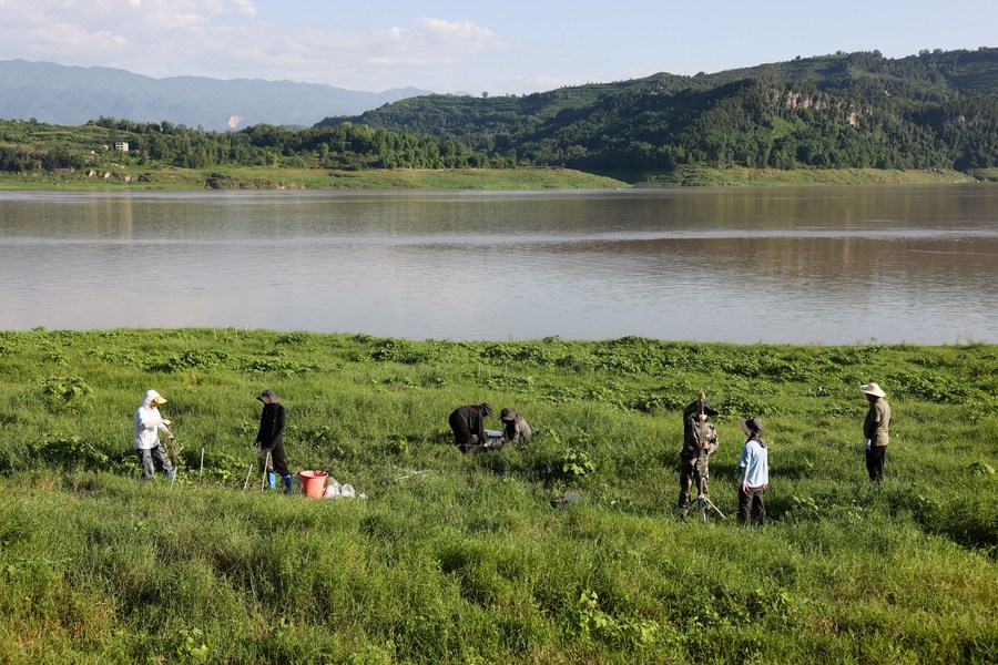 Researchers of the Institute of Mountain Hazards and Environment under Chinese Academy of Sciences (CAS) collect soil samples at a water-level fluctuation zone of the Three Gorges Reservoir in Zhongxian County, southwest China's Chongqing, July 6, 2023. (Xinhua/Huang Wei)