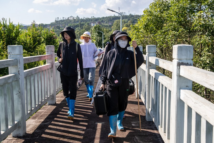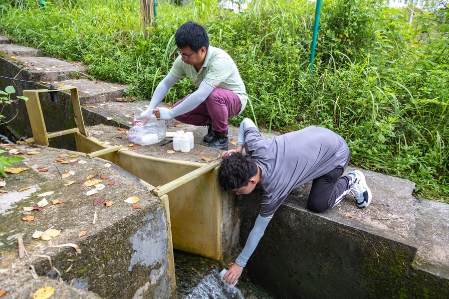 Researchers of the Institute of Mountain Hazards and Environment under Chinese Academy of Sciences (CAS) collect water samples in Zhongxian County, southwest China's Chongqing, July 6, 2023. (Xinhua/Huang Wei)