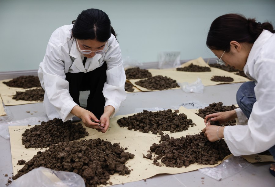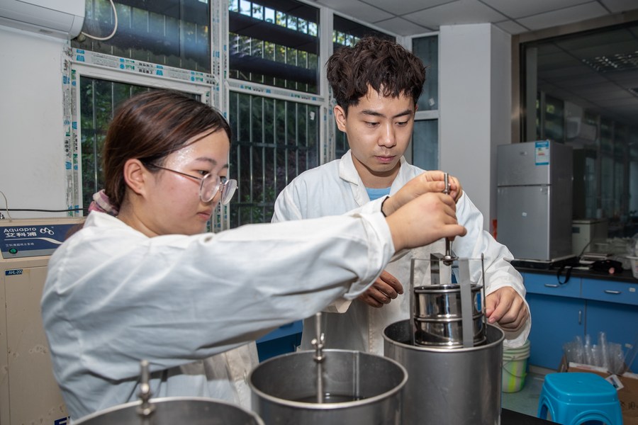 Researchers of the Institute of Mountain Hazards and Environment under Chinese Academy of Sciences (CAS) assess water-stable soil aggregates at a research station in Zhongxian County, southwest China's Chongqing, July 5, 2023. (Xinhua/Chu Jiayin)