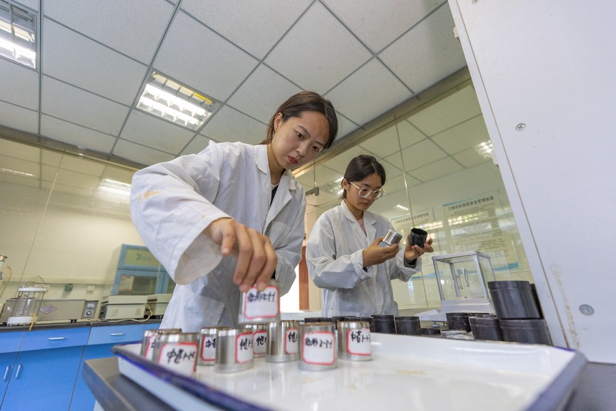 Researchers of the Institute of Mountain Hazards and Environment under Chinese Academy of Sciences (CAS) process soil samples at a research station in Zhongxian County, southwest China's Chongqing, July 5, 2023. (Xinhua/Jin Liwang)