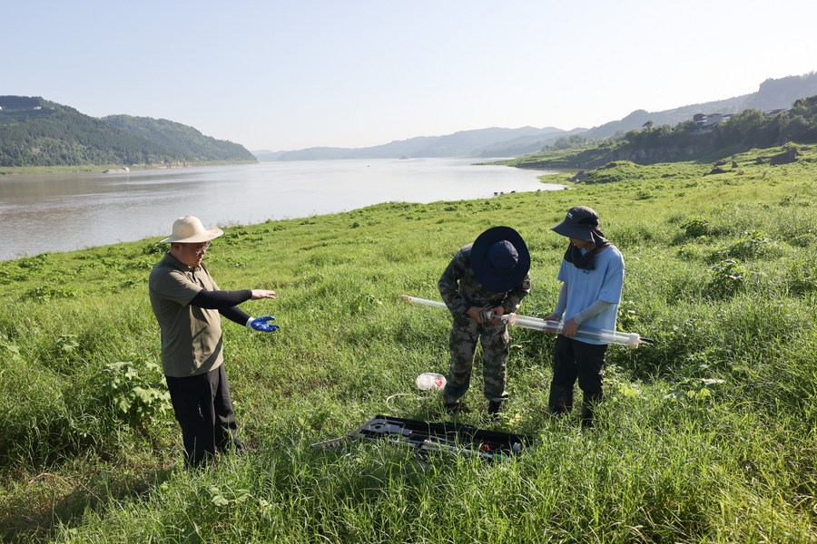 Researchers of the Institute of Mountain Hazards and Environment under Chinese Academy of Sciences (CAS) carry out scientific monitoring at a water-level fluctuation zone of the Three Gorges Reservoir in Zhongxian County, southwest China's Chongqing, July 5, 2023. (Xinhua/Jin Liwang)