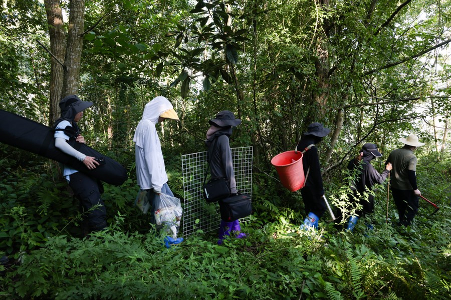 Researchers of the Institute of Mountain Hazards and Environment under Chinese Academy of Sciences (CAS) measure soil porosity at a research station in Zhongxian County, southwest China's Chongqing, July 5, 2023. (Xinhua/Huang Wei)