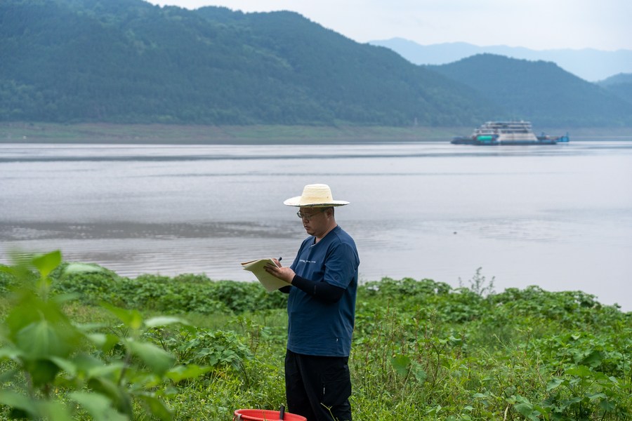 A researcher of the Institute of Mountain Hazards and Environment under Chinese Academy of Sciences (CAS) carries out scientific monitoring at a water-level fluctuation zone of the Three Gorges Reservoir in Zhongxian County, southwest China's Chongqing, July 6, 2023. (Xinhua/Zhou Dixiao)