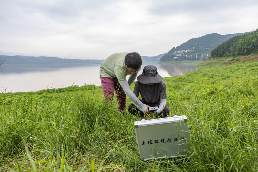 Researchers of the Institute of Mountain Hazards and Environment under Chinese Academy of Sciences (CAS) measure soil temperature and humidity at a water-level fluctuation zone of the Three Gorges Reservoir in Zhongxian County, southwest China's Chongqing, July 6, 2023. (Xinhua/Huang Wei)■