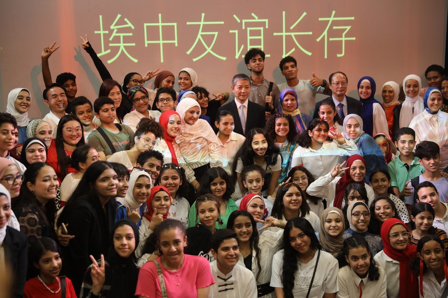 Egyptian students pose for photos during the closing ceremony of the first Chinese language summer camp in Cairo, Egypt, on July 18, 2023. (Xinhua/Ahmed Gomaa)