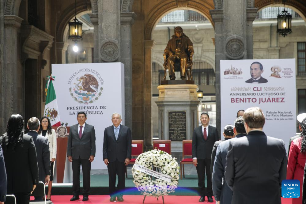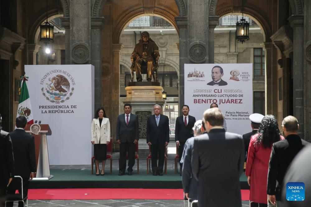 Mexican President Andres Manuel Lopez Obrador (3rd L, rear) attends a ceremony marking the 151st anniversary of the death of Mexico's former President Benito Juarez at National Palace, Mexico City, Mexico, July 18, 2023. (Photo by Francisco Canedo/Xinhua)