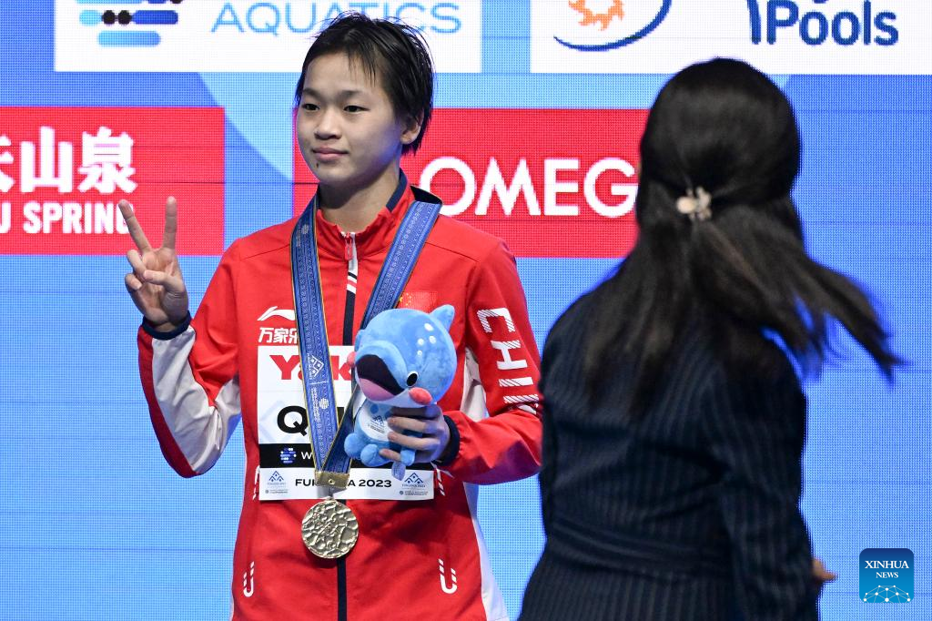 Quan Hongchan of China reacts during the awarding ceremony of women's 10m platform final of the World Aquatics Championships 2023 in Fukuoka, Japan, July 19, 2023. (Xinhua/Xu Chang)
