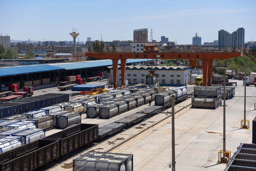 Workers load goods at a railway freight yard in Korla City, northwest China's Xinjiang Uygur Autonomous Region, May 30, 2023. (Xinhua/Ding Lei)